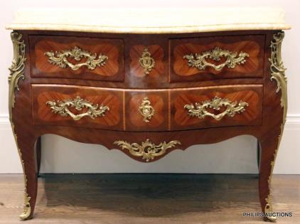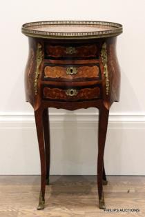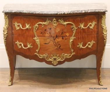 A LOUIS XV STYLE TULIPWOOD INLAID BOMBE COMMODE