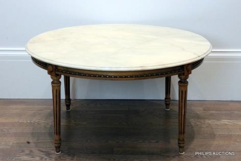 A LOUIS XVI STYLE MARBLE TOP COFFEE TABLE