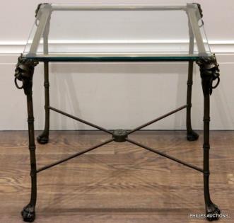 A BRONZE AND GLASS SIDE TABLE WITH MASKS