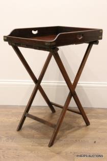 A GEORGE III MAHOGANY AND BRASS BOUND BUTLER'S TRAY ON STAND