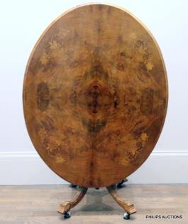 A VICTORIAN INLAID WALNUT OVAL TILT TOP DINING TABLE