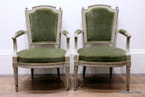 A PAIR OF 18TH CENTURY LOUIS XVI PAINTED FAUTEUILS