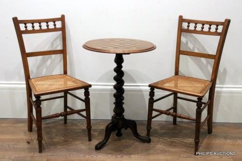 A VICTORIAN BARLEY TWIST MAHOGANY WINE TABLE and TWO SPINDLE BACKED CANE SEATED CHAIRS