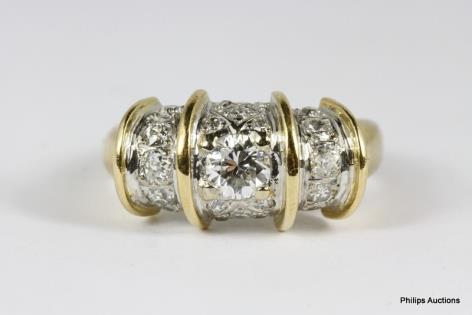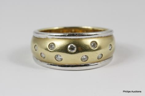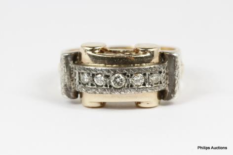A STYLISH RETRO 18CT YELLOW & WHITE GOLD 0.30CTS DIAMOND DETAILED UNISEX RING 7.3GRAMS