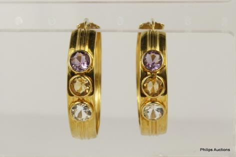 A PAIR OF CITRINE, AMETHYST, TOPAZ SET OVERSIZED 18CT YELLOW GOLD HOOPS 16GRAMS