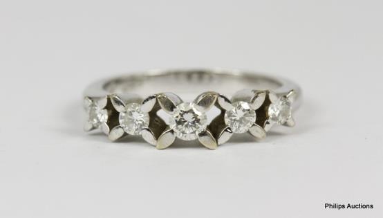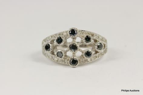 A MODERN 18CT WHITE GOLD, 0.10CTS DIAMOND SET BAND RING WITH GRADUATING X DESIGN 3.3GRAMS