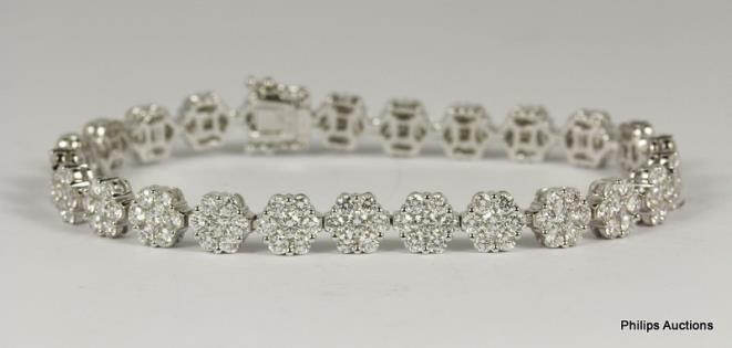 AN 18CT WHITE GOLD, FLORAL DIAMOND CLUSTER LINE BRACELET TOTALLING 8.16CTS & WEIGHING 19.3GRAMS