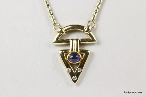 A 14CT YELLOW GOLD, CABOCHON SAPPHIRE AND DIAMOND PENDANT ON FIXED CHAIN 15.5GRAMS