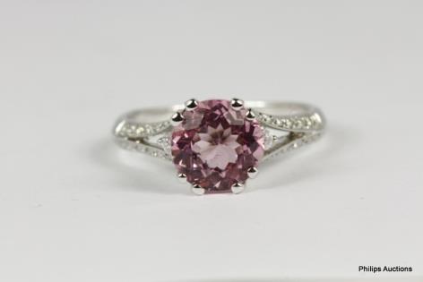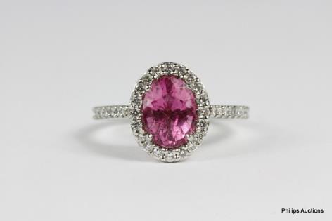 AN 18CT WHITE GOLD, 2.00CTS PINK TOURMALINE AND 0.35CTS DIAMOND OVAL CLUSTER RING 5.2GRAMS