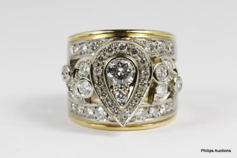AN 18CT WHITE AND YELLOW GOLD, PEAR SHAPE MULTI DIAMONDS (TOTALLING 1.90CTS) PANEL RING 18.5GRAMS