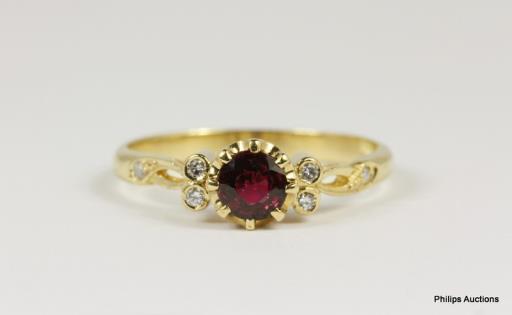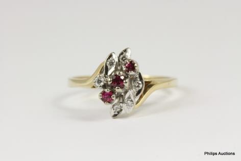 AN 18CT YELLOW GOLD HANDMADE THREE STONE 0.35CTS RUBY AND 0.14CTS DIAMOND DRESS RING 2GRAMS