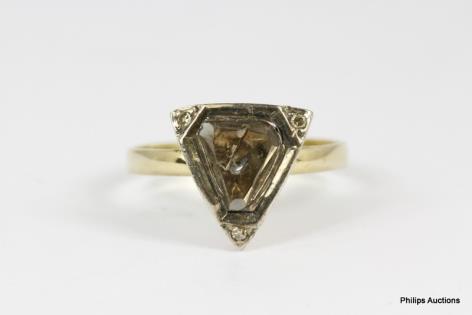 AN ARTISAN STYLED TRILLION CUT DIAMOND SOLITAIRE 14CT YELLOW GOLD DRESS RING