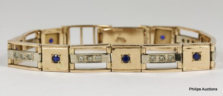 A RETRO 14CT ROSE GOLD SYNTHETIC SAPPHIRE & CZ SET BRACELET 30.7GRAMS