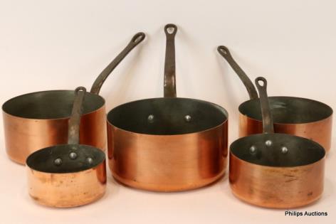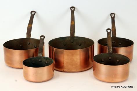 A SET OF FIVE COPPER SAUCEPANS