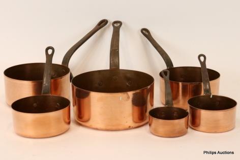 A SET OF SIX COPPER SAUCEPANS