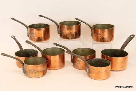 A GROUP OF NINE COPPER SAUCEPANS