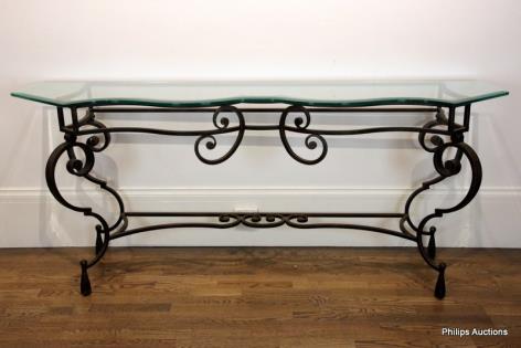 A GLASS TOPPED WROUGHT IRON HALL TABLE