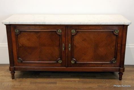 A LOUIS XVI STYLE MARBLE TOP WALNUT SIDEBOARD