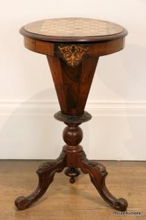 A VICTORIAN INLAID WALNUT CHESS AND SEWING TABLE