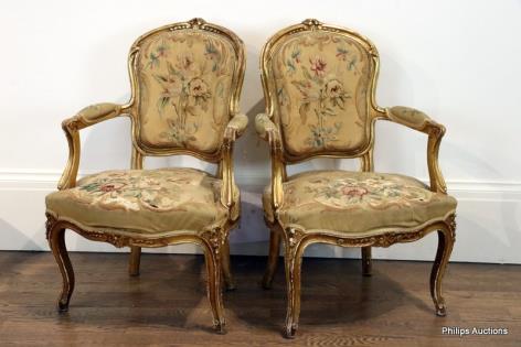 A PAIR OF LOUIS XV STYLE GILTWOOD OPEN ARMCHAIRS