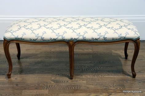 A CARVED WALNUT UPHOLSTERED OTTOMAN AND PILLOW
