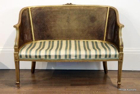 A LOUIS XVI STYLE CANED BACK GILTWOOD SETTEE