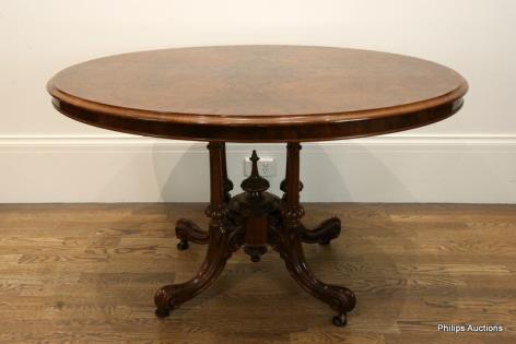 A VICTORIAN BURR WALNUT TILT TOP OVAL TABLE