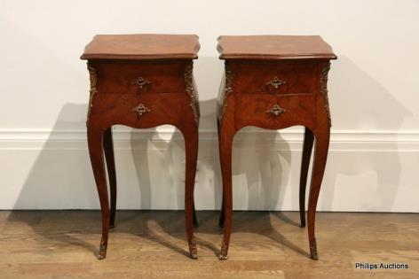 A PAIR OF LOUIS XV STYLE INLAID TULIPWOOD BEDSIDE TABLES