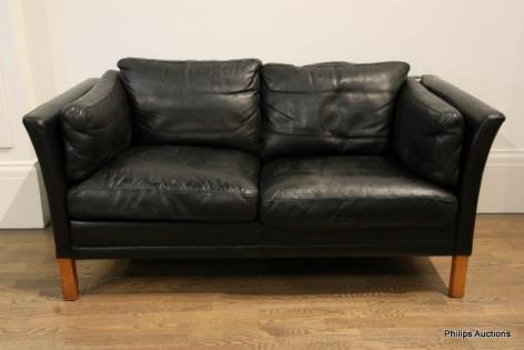 A DANISH TWO-SEATER BLACK LEATHER COUCH