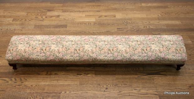 A LONG UPHOLSTERED FIRESIDE FOOTSTOOL