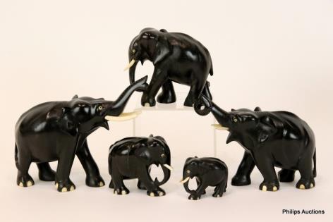 A GRADUATED GROUP OF FIVE EBONY ELEPHANTS