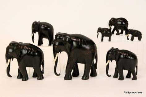 A GRADUATED GROUP OF SEVEN EBONY ELEPHANTS