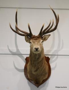 A TAXIDERMY SHOULDER MOUNTED RED DEER