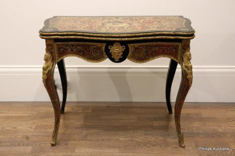 A NAPOLEON III ORMOLU-MOUNTED AND BRASS-INLAID BOULLE STYLE CARD TABLE