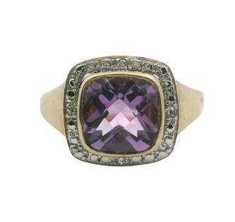 A 9CT YELLOW & WHITE GOLD CUSHION CHECKERBOARD AMETHYST RING, SIZE P1/2, TOTAL WEIGHT 3.2GRAMS