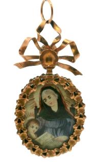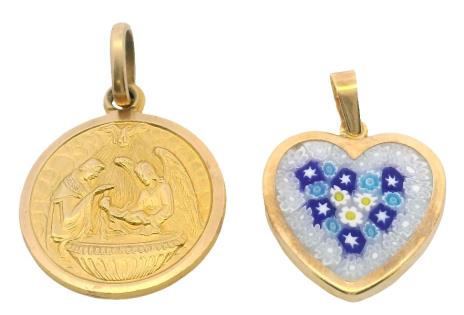 AN 18CT YELLOW GOLD ROUND RELIGIOUS PENDANT & HEART SHAPE MURANO GLASS PENDANT, TOTAL WEIGHT 5.7GR
