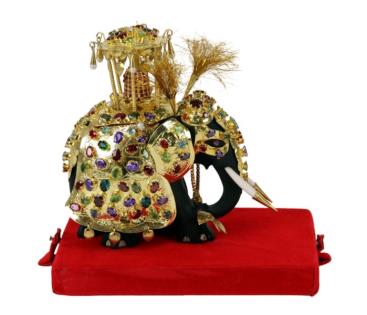 A GOLD PLATED GEMSTONE ENCRUSTED ELEPHANT DECORATIVE PIECE