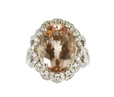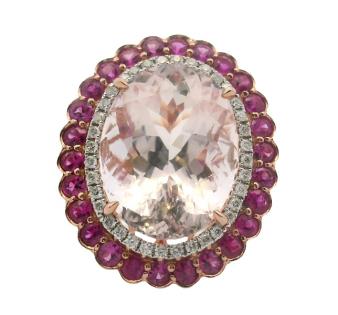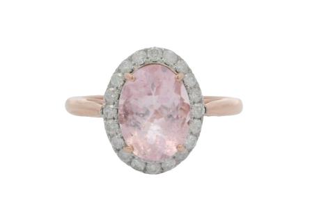 A 14K ROSE GOLD OVAL CUT MORGANITE OF 2.07CT & DIAMOND (.22CT) HALO RING, SIZE: N1/2, T.W.: 3GRAMS