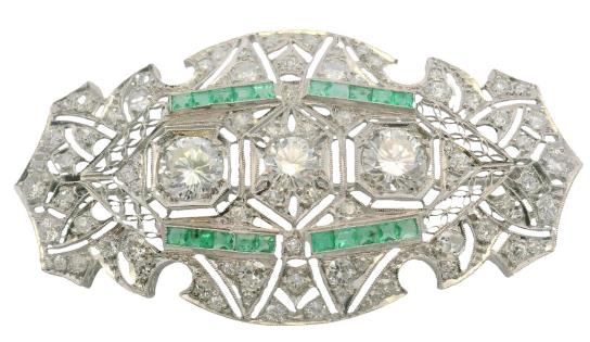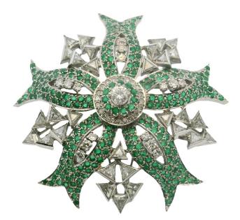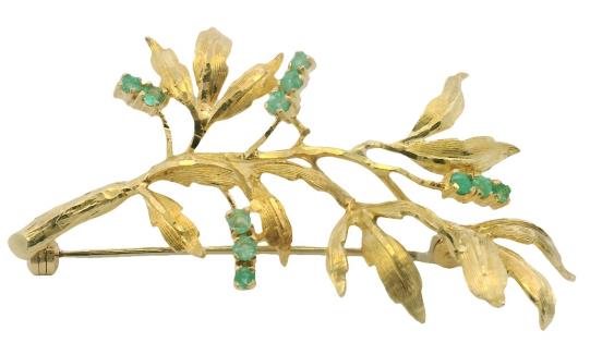 AN 18K YELLOW GOLD EMERALD SET LEAF BROOCH, WEIGHING 8.9GRAMS