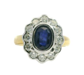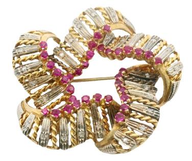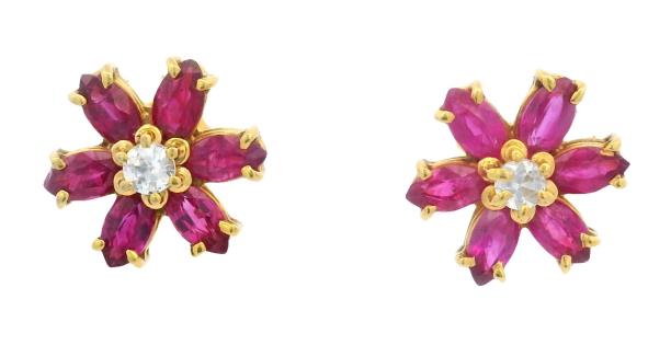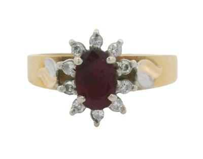 AN 18K Y/W GOLD VINTAGE STYLE OVAL CUT RUBY OF .50CT & ROUND CUT DIAMOND (.05CT) FLORAL CLUSTER RING