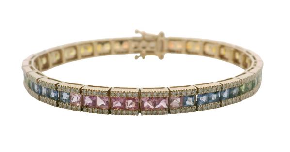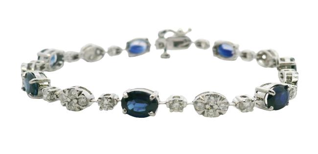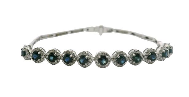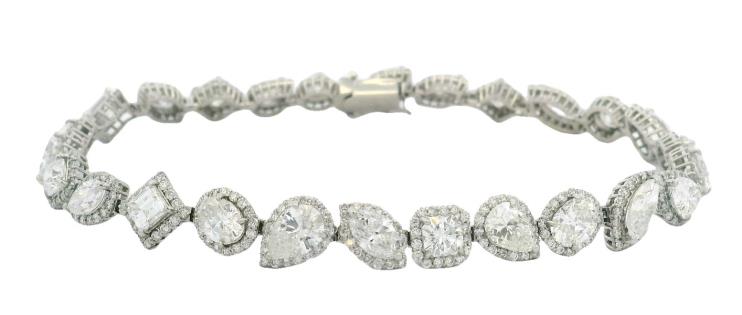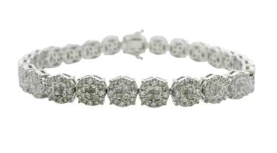 AN 18CT W.G. MULTI DIAMOND SET CLUSTER LINE BRACELET OF 5.05CTS TOTAL, 18CMS, 23.9GRAMS T.W.