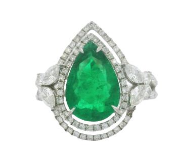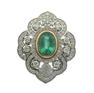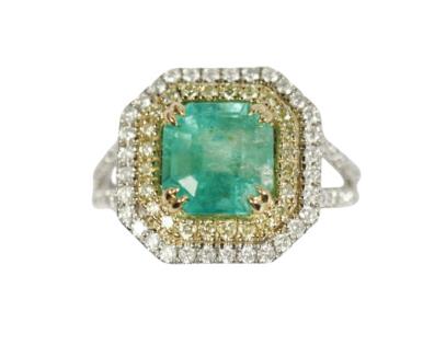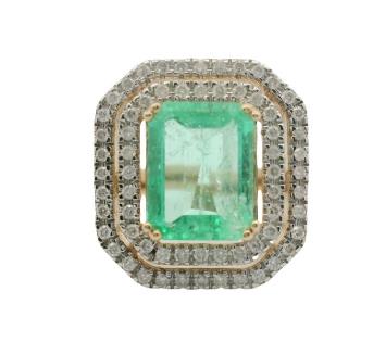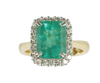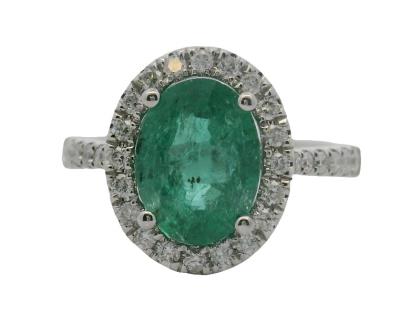 A 14K W.G EMERALD OF 1.88CT & DIAMOND (.38CT) HALO RING, SIZE: N1/2, T.W.: 3.4GRAMS