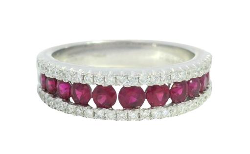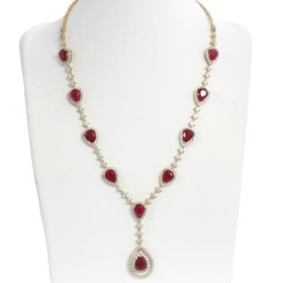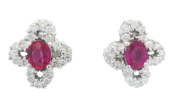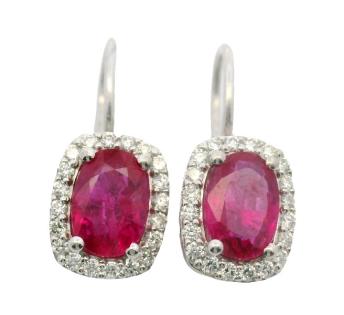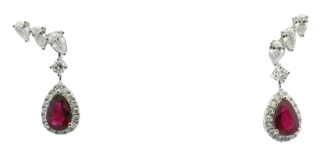 A PAIR OF 18K W.G PEAR CUT RUBIES OF 1.25CT, & MULTI DIAMONDS SMALL DROPS EARRINGS, T.W.: 3.5GRAMS