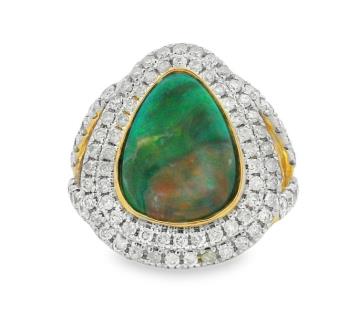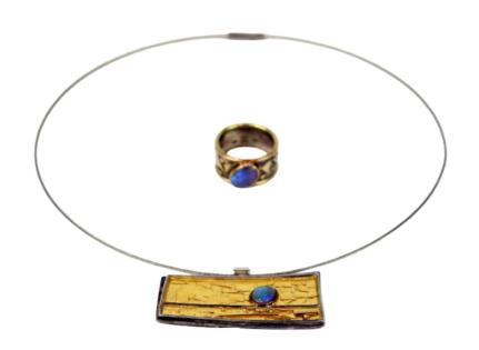 AN ARTISAN WORKED MODERNIST OPAL SET PENDANT & DRESS RING, SILVER & 18CT YELLOW GOLD, T.W. 23.1G