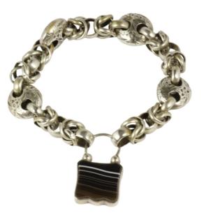 A LOVELY FANCY LINK ANTIQUE STERLING SILVER PADLOCK BRACELET WITH AGATE, TOTAL WEIGHT 19.1GRAMS