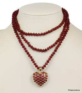 A STRAND OF TUMBLED RUBY BEADS & 14CT Y.G. RUBY SET HEART GOLD ENHANCER