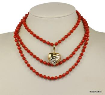 A 14CT & 9CT YELLOW GOLD TWO-TONED ILLUSION HEART ENHANCER ON SARDINIAN CORAL BEADS T.W. 19.9G