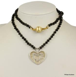 AN 18CT YELLOW GOLD DIAMOND SET HEART FRAME PENDANT ON A STRAND OF BLACK SPINEL BEADS, T.W. 12.2GR