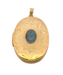 A 9CT YELLOW GOLD OVAL STAR ENGRAVED OPAL SET LOCKET, TOTAL WEIGHT 3.5GRAMS