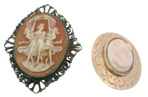 TWO CAMEO BROOCHES, 9CT GOLD & SILVER, TOTAL WEIGHT 7GRAMS